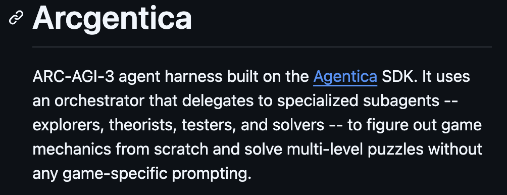 从GitHub页面中,我们在IDEA.md这个文件中,发现了Agentica框架的绝技——ARC-AGI-3智能体框架(Agent Harnesses)。