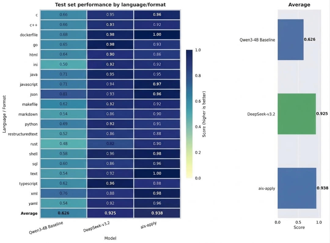 基准测试结果显示,在20多种主流编程语言及Markdown等多类型文件格式的测试中,aiX-apply-4B的平均准确率达到93.8%,超越Qwen3-4B基座模型62.6%的准确度,甚至高于千亿级大模型DeepSeek-V3.2。
