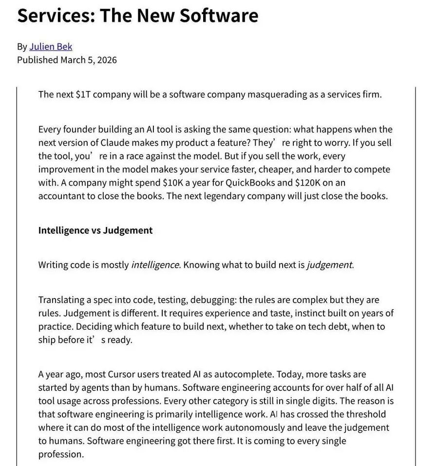 红杉合伙人Julien Bek在其文章“Service is the new software”(服务即新软件)中提出: