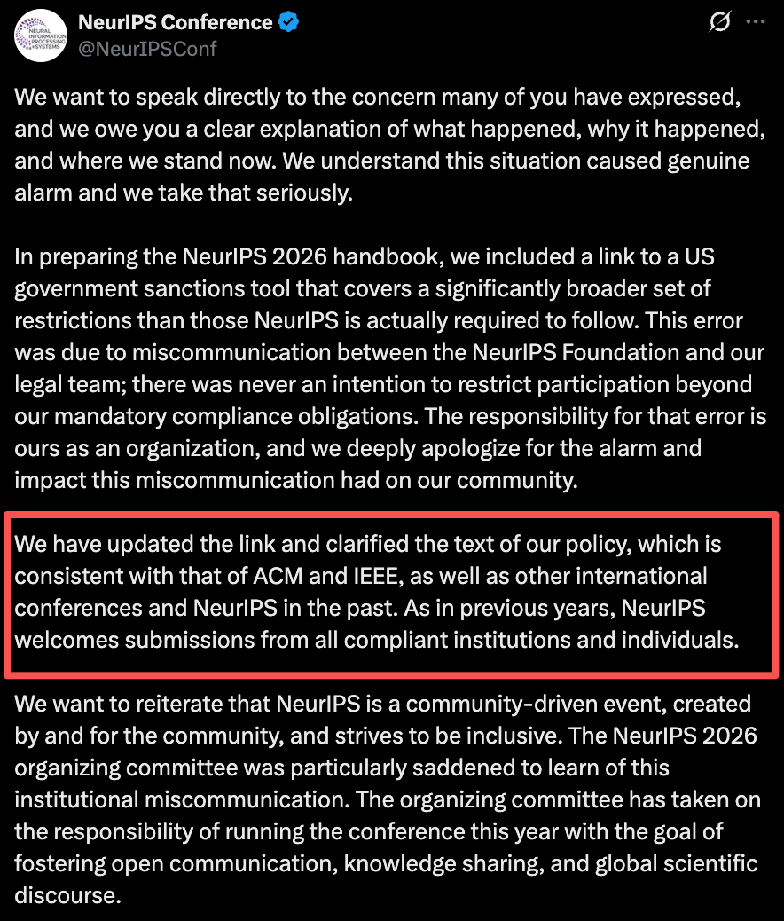 就在刚刚,NeurIPS在X上公开道歉,并表明: