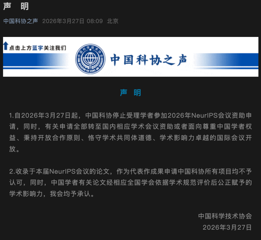 而就在今天早上,中国科协发表声明,表示从2026年3月27日起,中国科协停止受理学者参加2026年NeurIPS会议资助申请,同时不予认可以NeurIPS’26中稿论文为代表作的项目申请。