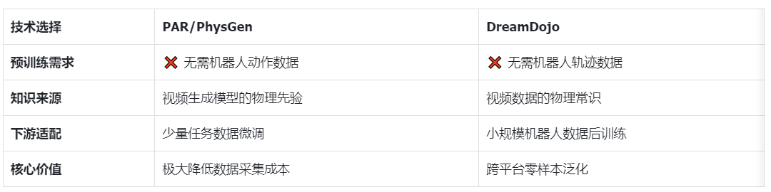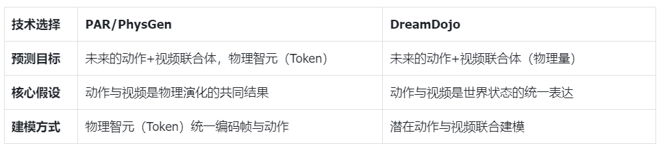 今年2月,英伟达发布了DreamDojo——一个基于大规模视频训练的通用机器人世界模型。对比PAR/PhysGen与DreamDojo,会发现两条路线在核心技术理念上惊人一致。