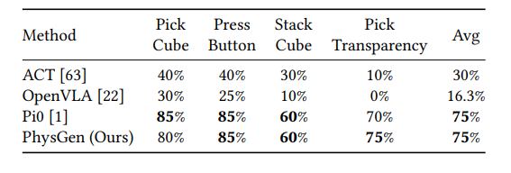 在最考验物理感知的透明物体抓取任务中,PhysGen反超了需要大规模预训练的π0模型——这说明从视频学到的物理直觉,在处理「视觉欺骗性强」的场景时更有优势。
