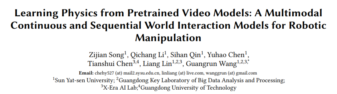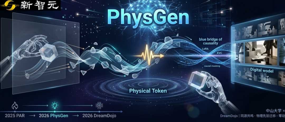 中山大学王广润教授给出了一个创新答案:不靠海量动作数据,直接从视频生成模型中「借」物理直觉。从PAR(物理自回归模型) 到其进阶版本PhysGen(从预训练视频模型中学习物理),两项工作一脉相承,共享同一套「物理自回归」核心框架,并与英伟达今年2月发布的DreamDojo在核心思路上高度重合——当两条独立探索的路线收敛到同一个方向,这或许意味着某种底层规律正在被揭示。