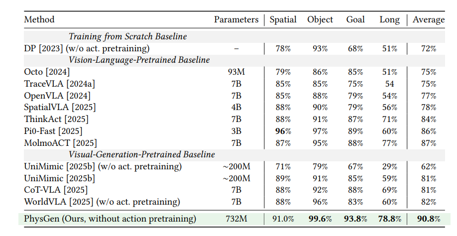 图3:732M参数、在零大规模动作预训练的前提下,Physgen取得平均90.8%成功率