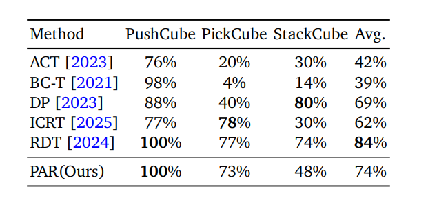 在PickCube与StackCube任务上,同样超过或接近需要动作预训练的强基准方法