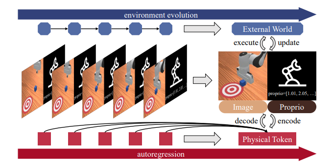 图1:物理token自回归的运作方式:预测未来的帧与动作联合体,与真实环境同步演化