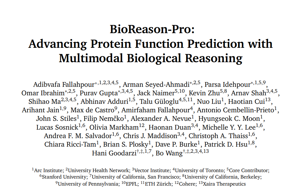 近日,Arc Institute、多伦多大学、Vector Institute 和 University Health Network 的联合团队在 bioRxiv 上发布了 BioReason-Pro,这是首个用于蛋白质功能预测的多模态推理大语言模型。它不仅在 GO 术语预测上达到了 73.6% 的 F_max,更在 27 位蛋白质专家的盲评中取得了惊人的成绩——在 79% 的评估案例中,专家认为 BioReason-Pro 的注释质量不低于甚至优于 UniProt 的人工审编条目。模型权重、代码、数据集和在线推理平台全部开源。