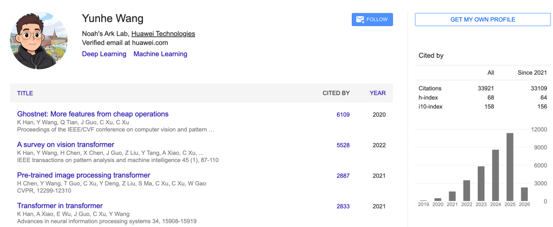 学术成果方面,根据Google Scholar,王云鹤的被引数为33109,h-index为68。
