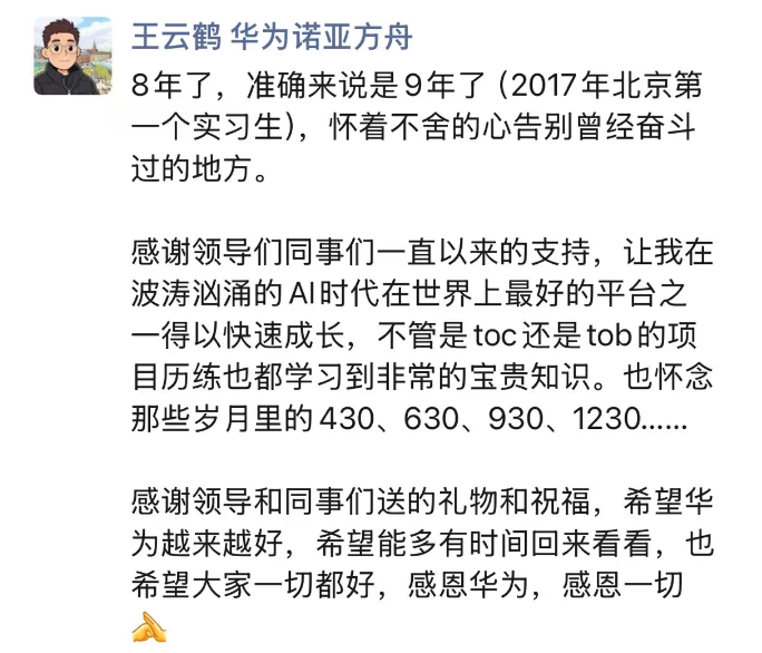 刚刚,华为盘古大模型负责人王云鹤,宣布离职。