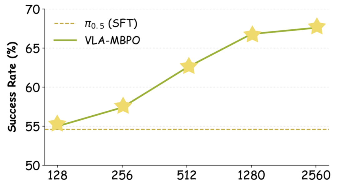 随着每轮imagined sample数量从128提升到2560,VLA-MBPO的成功率持续上升,没有出现明显平台期。