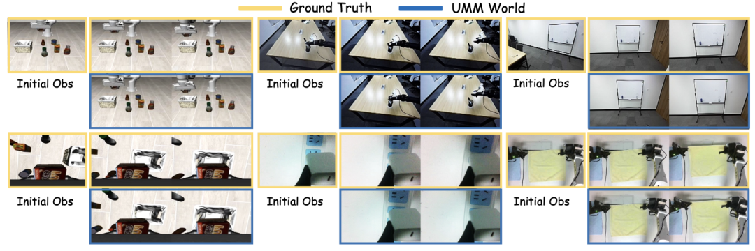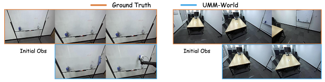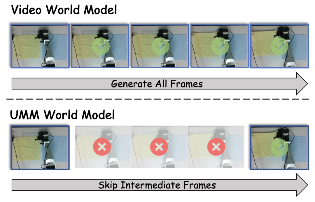 传统视频世界模型往往要生成所有中间帧,作者的UMM-World可以跳过中间帧,直接预测动作切块之后的未来状态。图2给出的就是这一路线和视频模型思路的直观对比。