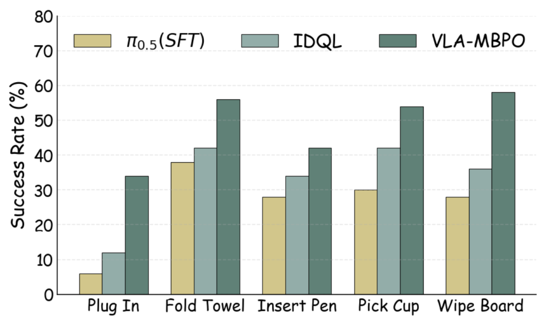 真机对比结果在图5。从图中可以看到,VLA-MBPO在五个任务上都稳定优于仅做SFT的VLA策略和离线RL基线IDQL。