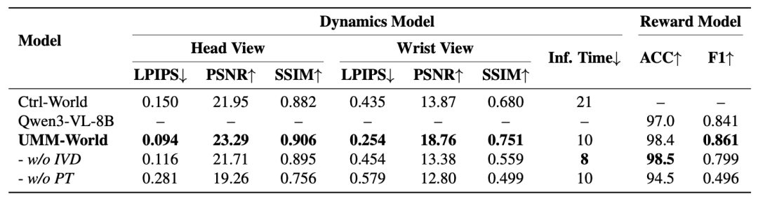 在LIBERO Object套件上,UMM-World相比视频世界模型Ctrl-World,在头视角和腕视角预测质量上都更好,推理时间从21降到10;用于奖励判断时,准确率达到98.4%,F1为0.861,已经和专门做视觉理解的Qwen3-VL-8B同一个量级,甚至更高。