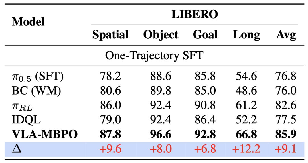 VLA-MBPO最大的优势恰恰体现在长程任务上,这说明它真正缓解的是世界模型最容易失控的部分:长推演下的策略优化。