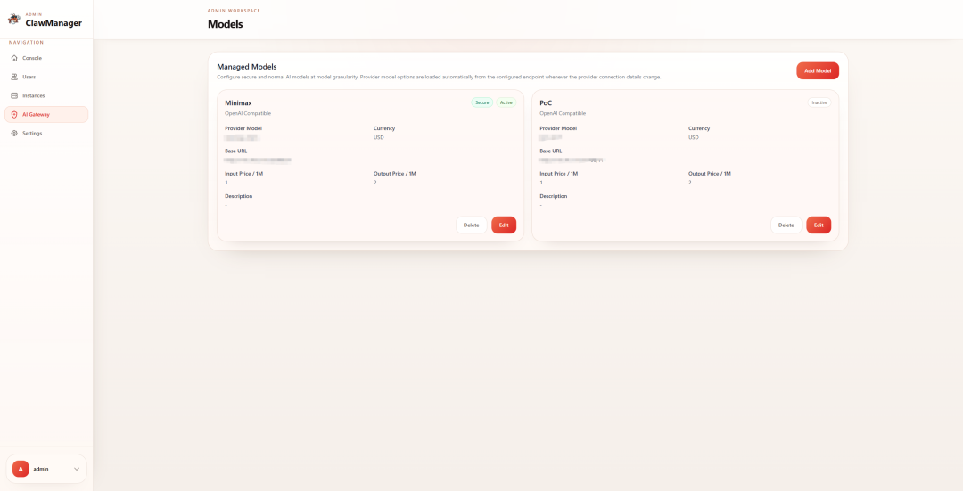 所有模型调用必须走这个闸门!普通模型和安全模型彻底隔离。Provider、端点、价格策略随便你配,随时启停。