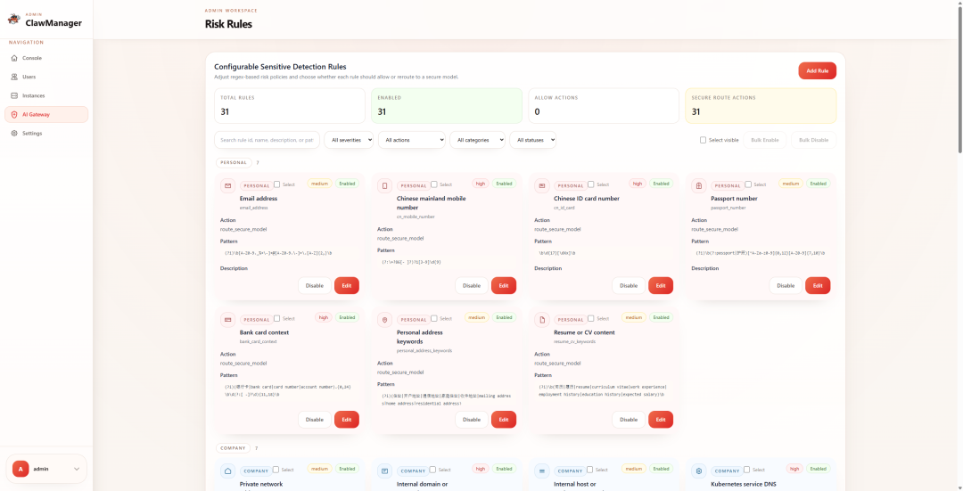 Risk Rules风险治理模块允许配置敏感词检测与内容拦截规则,为企业AI使用划定安全边界。