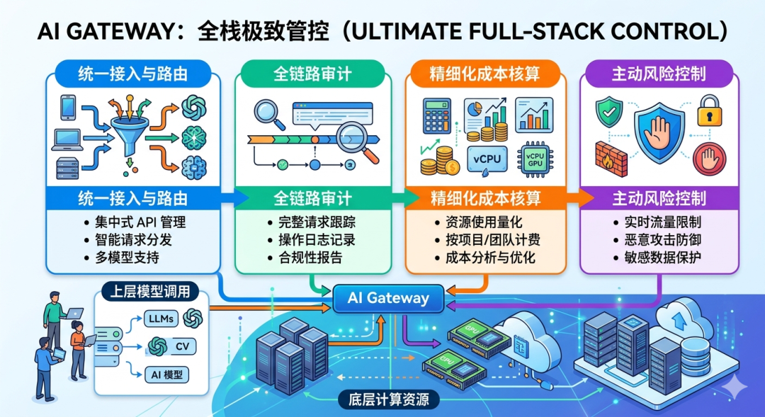通过这四大模块——统一接入与路由、全链路审计、精细化成本核算、主动风险控制——AI Gateway把从底层计算资源到上层模型调用的全栈管控做到了极致。
