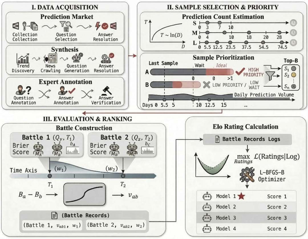 一个持续运转的动态评测引擎; 一套面向未来事件的后训练流程(Train-on-Future); 一个未来可能的AI原生预测API。