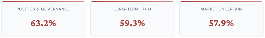 治理领域:EchoZ胜率63.2% 长期预测(7天以上):EchoZ胜率59.3% 市场不确定区间(人类信心55%-70%):EchoZ胜率57.9%