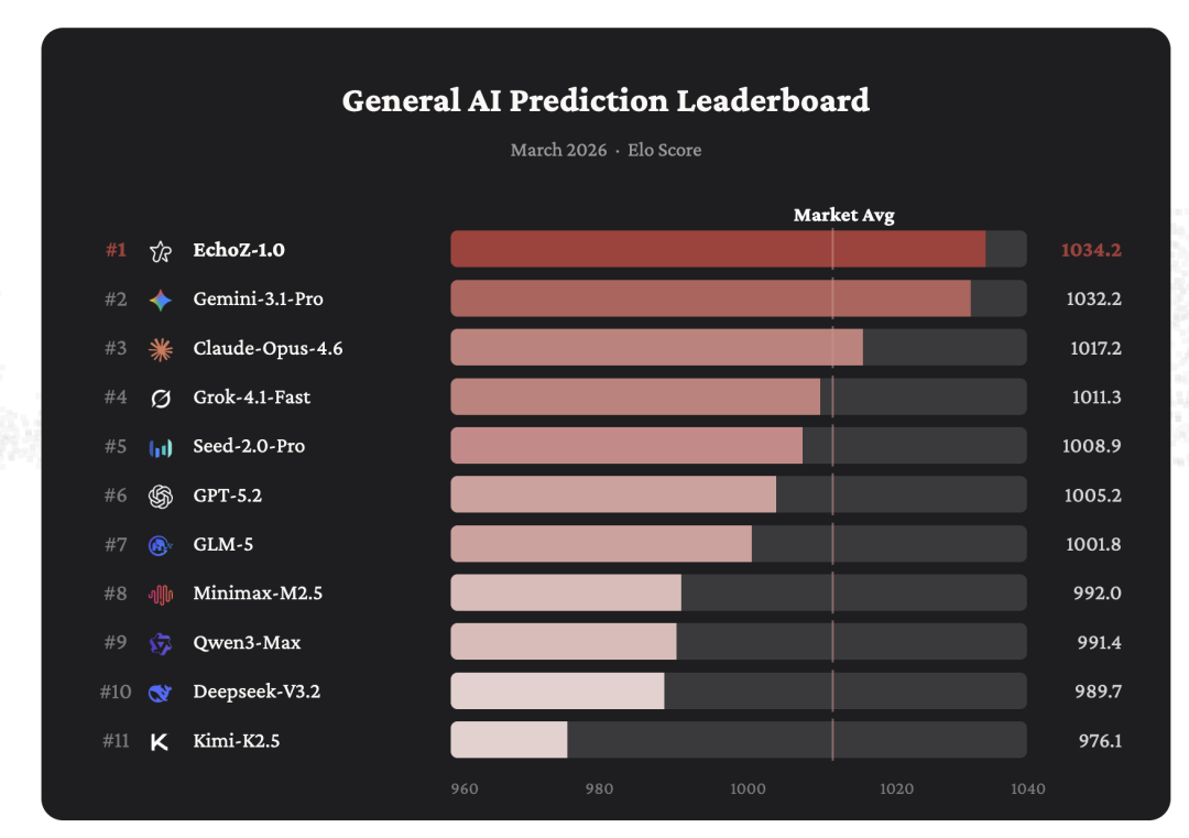 在General AI Prediction Leaderboard 上(2026年3月数据),EchoZ-1.0以Elo 1034.2排名第一,领先 Google的Gemini-3.1-Pro(1032.2)和Anthropic的Claude-Opus-4.6(1017.2)。