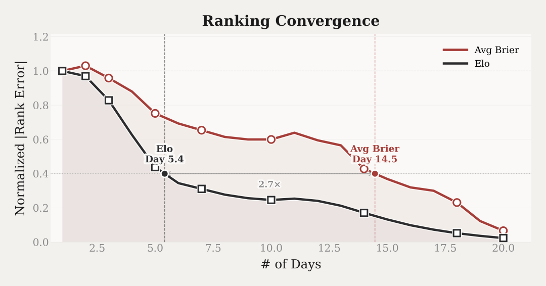 这是解决时序不对称问题的关键环节。评测使用point-aligned Elo机制:严格只比较「同一道题、同一预测时间点」的结果。所有参赛模型在完全相同的信息上下文下对决,公平性由此建立。
