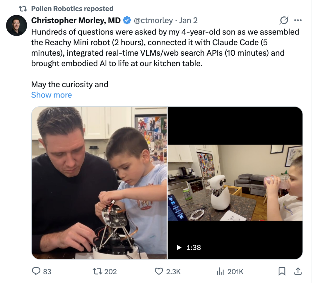 Q:作为一个一款桌面机器人,Reachy Mini更应该被理解为一个AI+陪伴产品,还是一个具身智能的载体,你们更倾向于哪一种定位?