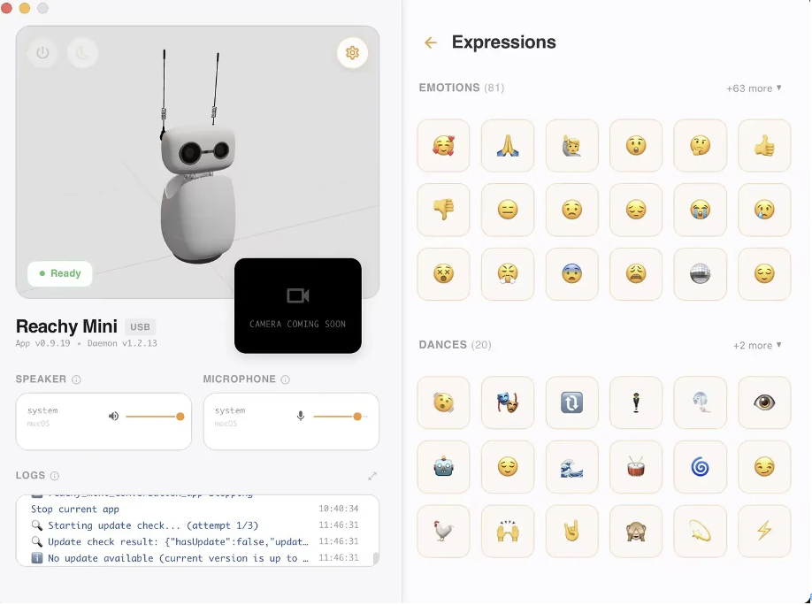 相比之下,机器人形态能带来更强的互动体验。比如Reachy Mini里有一个emoji功能,当你触发不同表情时,它会通过转动脑袋、摆动触角、配合声音做出反馈。
