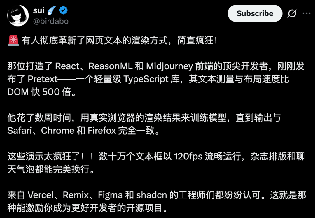 更恐怖的是,Pretext让网页排版速度飙升数百倍,渲染体验直达120帧极致丝滑。