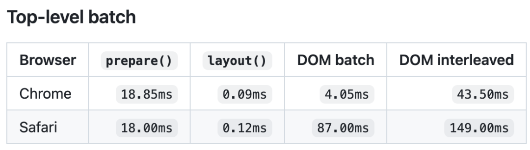 Safari上更夸张,layout() 0.12毫秒,DOM交错测量149.00毫秒,快了超1242倍——整整三个数量级。