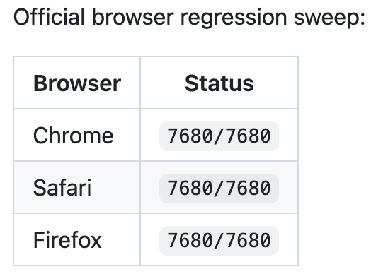 精度方面,Chrome、Safari、Firefox三大浏览器7680项穷举测试,全部满分通过,像素级吻合。
