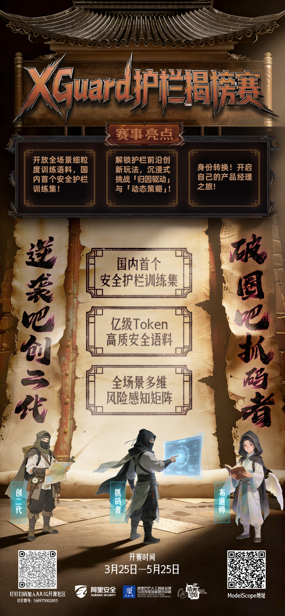 玩法: 选手需基于XGuard开源数据集(允许扩充新数据),结合XGuard模型或其他开源模型(10B 及以下),训练并提交专属的安全护栏模型。