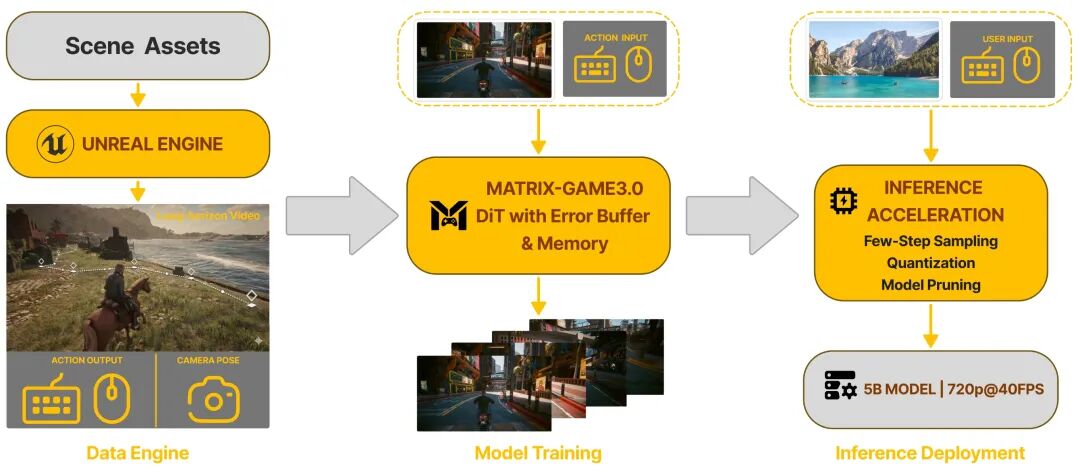 更重要的是,Matrix-Game 3.0 还打通了 GTA5、荒野大镖客 2、赛博朋克 2077 等多款 3A 游戏,构建了跨游戏的自动化数据采集体系,为模型训练提供了海量、高质量的交互式视频数据。