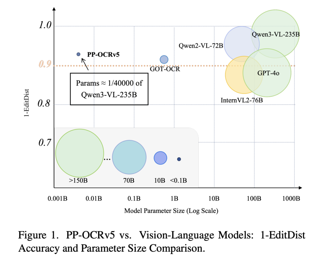 在内部多场景基准测试中,PP-OCRv5加权准确率从PP-OCRv4的53.0%大幅提升至80.1%,在OmniDocBench上,该模型以5M参数实现0.067的平均归一化编辑距离,在专用OCR模型中达到最优水平,在多语言处理、旋转文本、复杂背景等场景表现稳健,定位精度更高、幻觉更少、计算成本远低于百亿参数视觉语言模型。