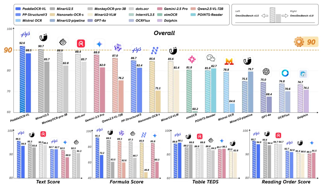 PaddleOCR-VL仅0.9B参数量,就在全球权威文档解析评测榜单OmniDocBench V1.5上拿下92.6分的成绩,超越Gemini-2.5 Pro、GPT-4o等与其体量悬殊的多模态大模型以及OCR领域的垂直模型dots.ocr、MinerU等,获得综合性能全球第一。