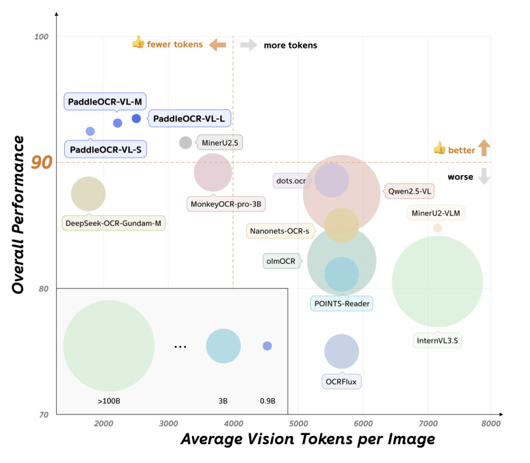 结果,视觉Token数量只有竞品的1/3到1/2,精度反而更高。如前所述,在OmniDocBench V1.5权威榜单上,PaddleOCR-VL以92.62分的综合成绩登顶全球第一。