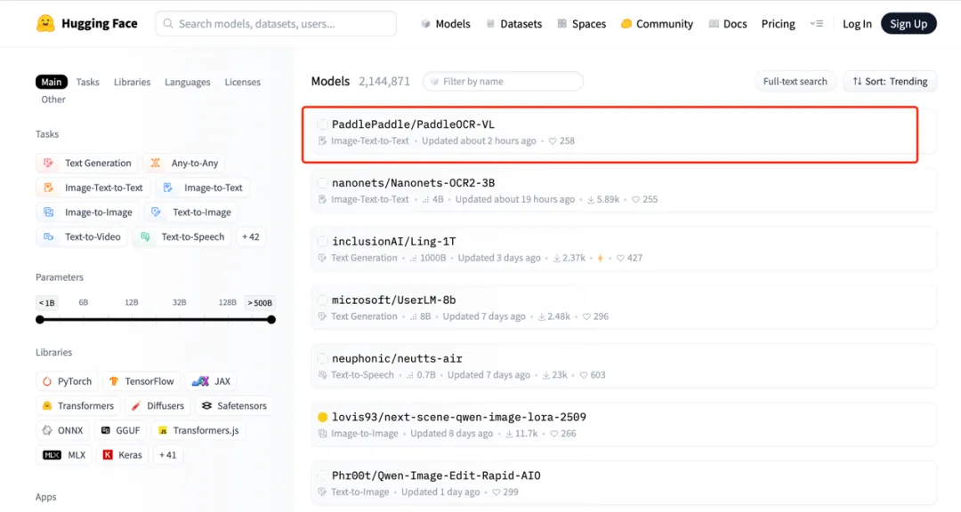 不仅如此,在Hugging Face上,PaddleOCR也长期处于OCR与文档解析领域的头部位置,已经成为全球开发者的必备工具。