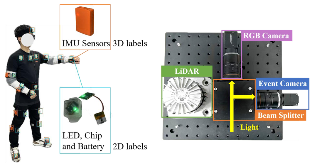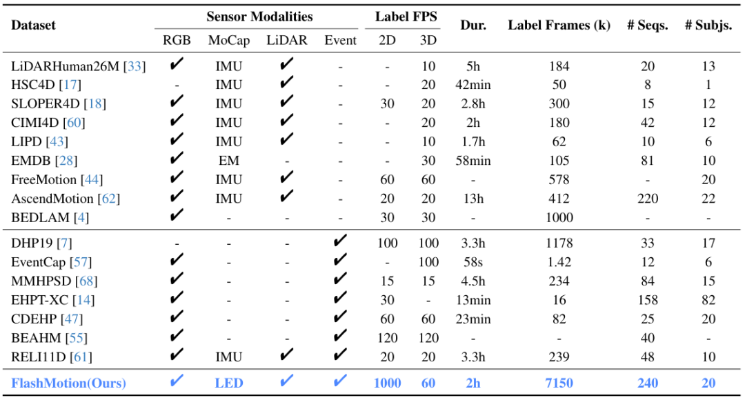 基于FlashCap系统,研究团队采集并开源了FlashMotion数据集。不仅多模态(囊括事件流、RGB、LiDAR点云和 IMU),更在数据维度上完成了真正的降维打击: