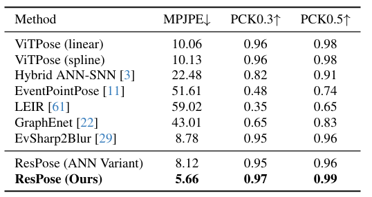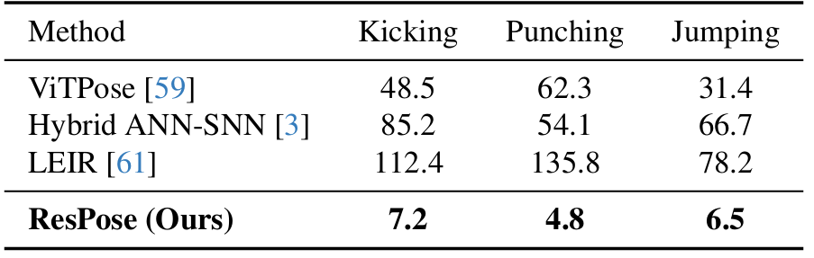 传统的 RGB 方法(如 ViTPose) 面对高速动态直接捕捉缺失,时间误差高达 50 毫秒以上 。