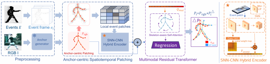 Event分支(残差): 引入混合SNN-CNN编码器专门处理高频事件流。模型会在 RGB 锚点周围进行局部截取,精准捕捉微秒级的运动残差。
