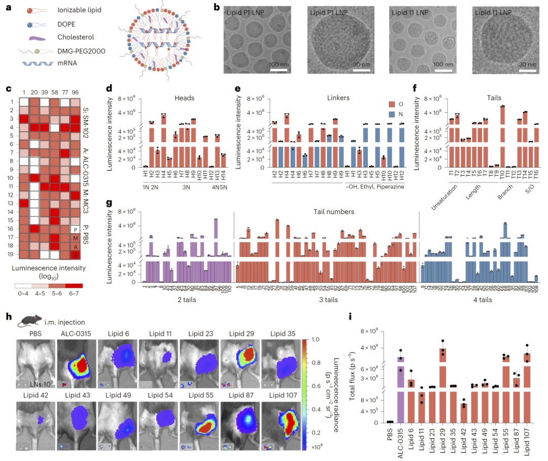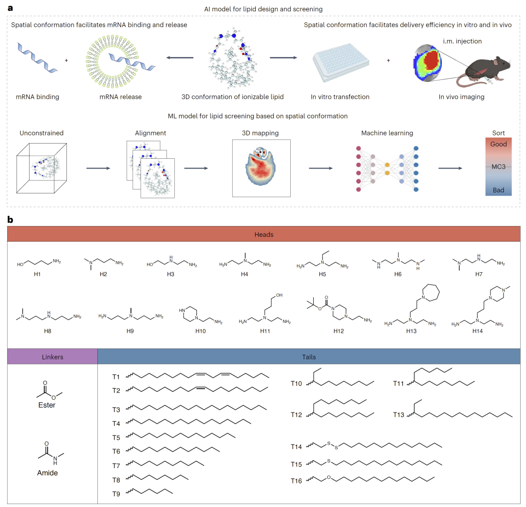 研究人员首先通过组合化学策略构建了一个包含1,408种离子化脂质的结构库,通过系统改变氨基头基、可降解连接基以及疏水尾链数量与结构,获得丰富的三维构象多样性。