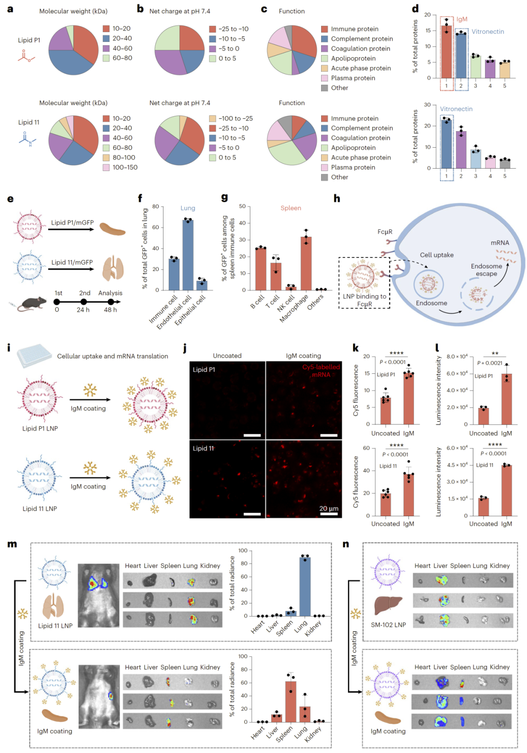 蛋白质组学分析表明,不同构象的脂质会形成不同类型的蛋白冠。例如,P1脂质能够富集IgM蛋白,从而引导LNP向脾脏分布。