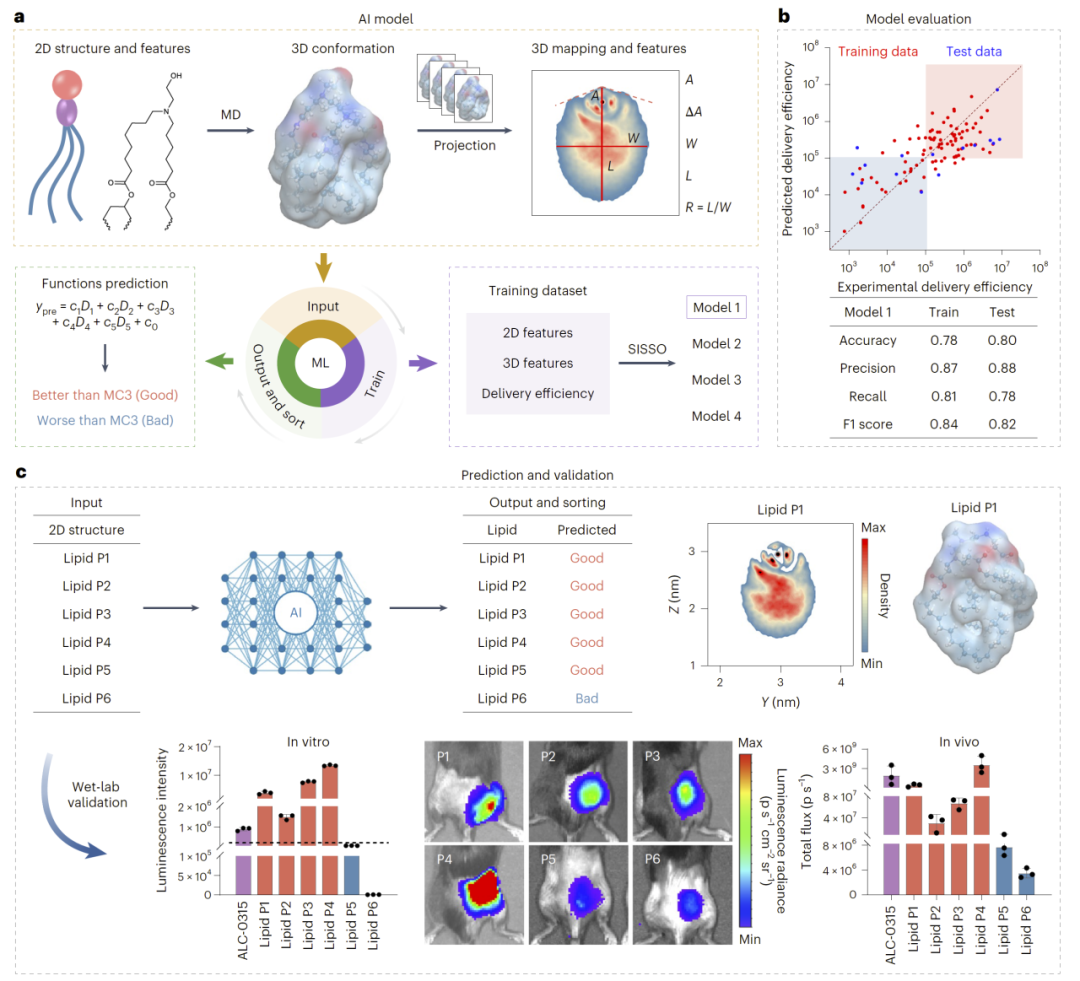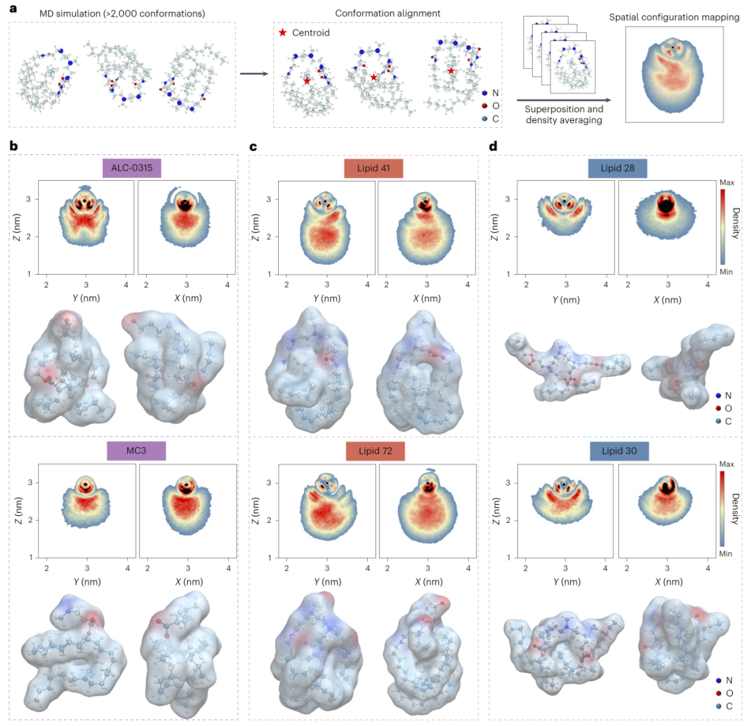 研究人员构建了多维结构变化的脂质库,并建立了从三维构象到机器学习预测的完整流程。该框架实现了从“结构设计—构象解析—性能预测—实验验证”的闭环。