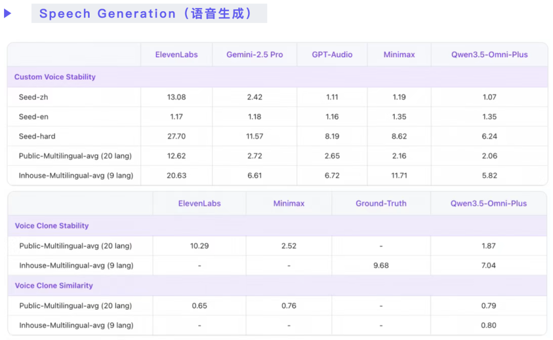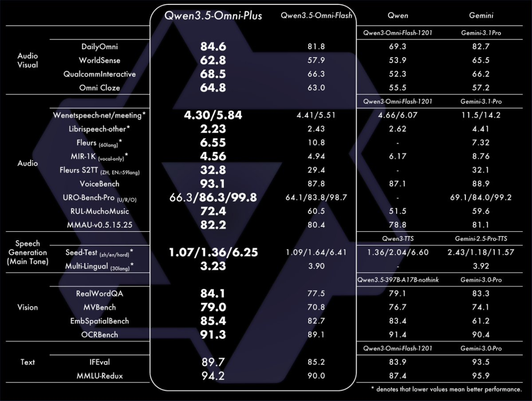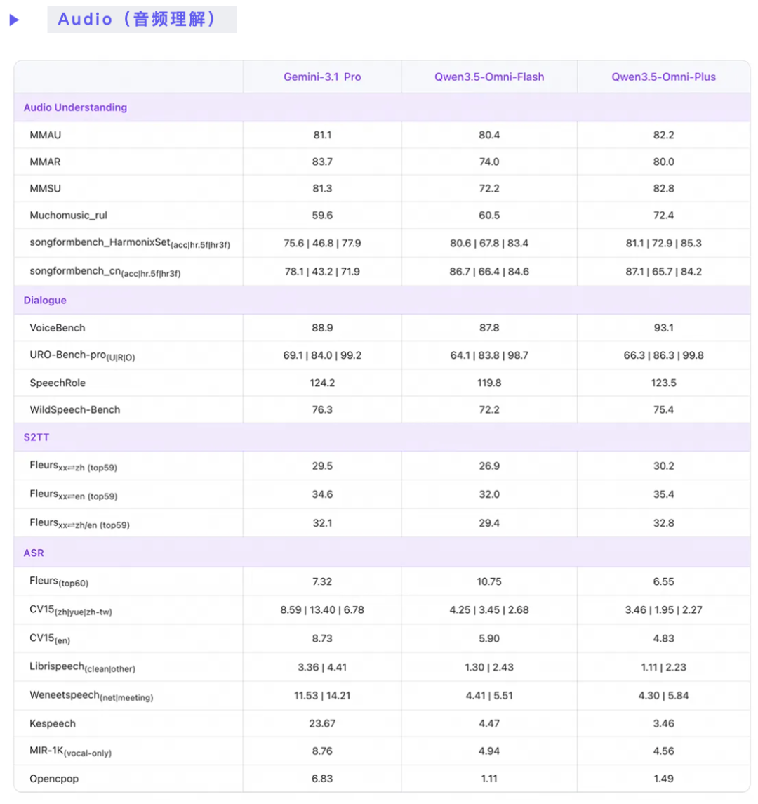 接下来详细唠唠Qwen3.5-Omni在benchmark上的表现。