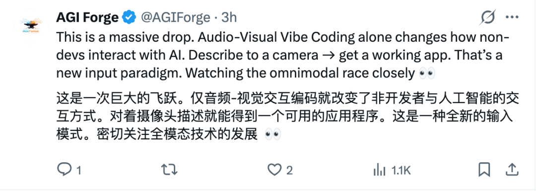 Qwen3.5-Omni还有一大亮点:自然涌现的vibe coding能力。它可以在实时视频通话中,根据画面逻辑生成Python代码或前端原型。