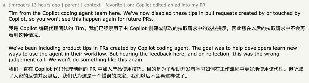 只不过官方说法是Copilot本来只在自己生成的内容里附带产品使用提示,这次更新扩大了权限,允许开发者在任意PR里@Copilot参与编辑。