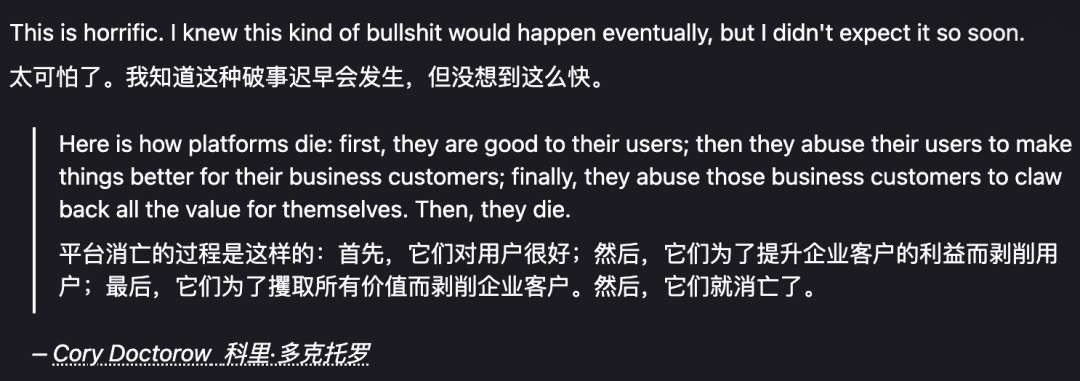 从作者po出的截图可以看出这段文字确实是Copilot先后两次自动编辑加上去的,于是他引用了科技作家Cory Doctorow的一句话控诉这种硬广行为: