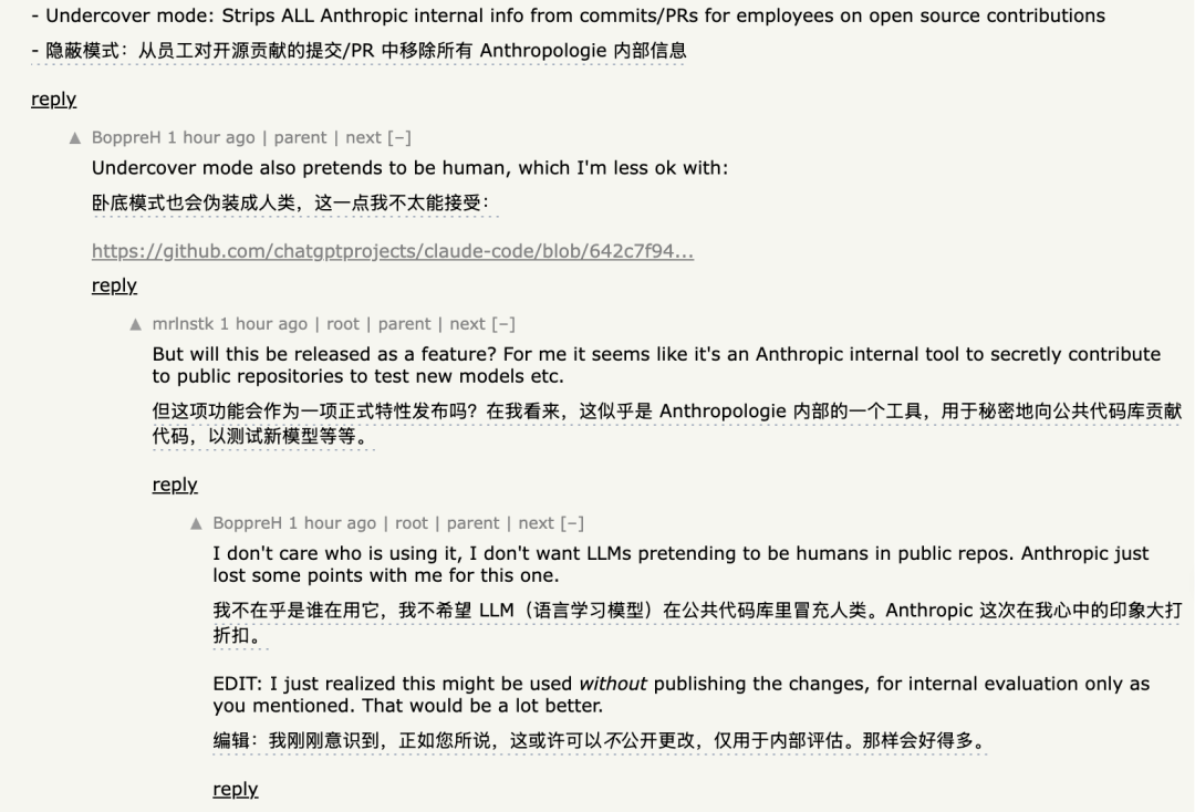 卧底模式(Undercover mode),向开源代码的提交PR时,移除所有Anthropic的信息。