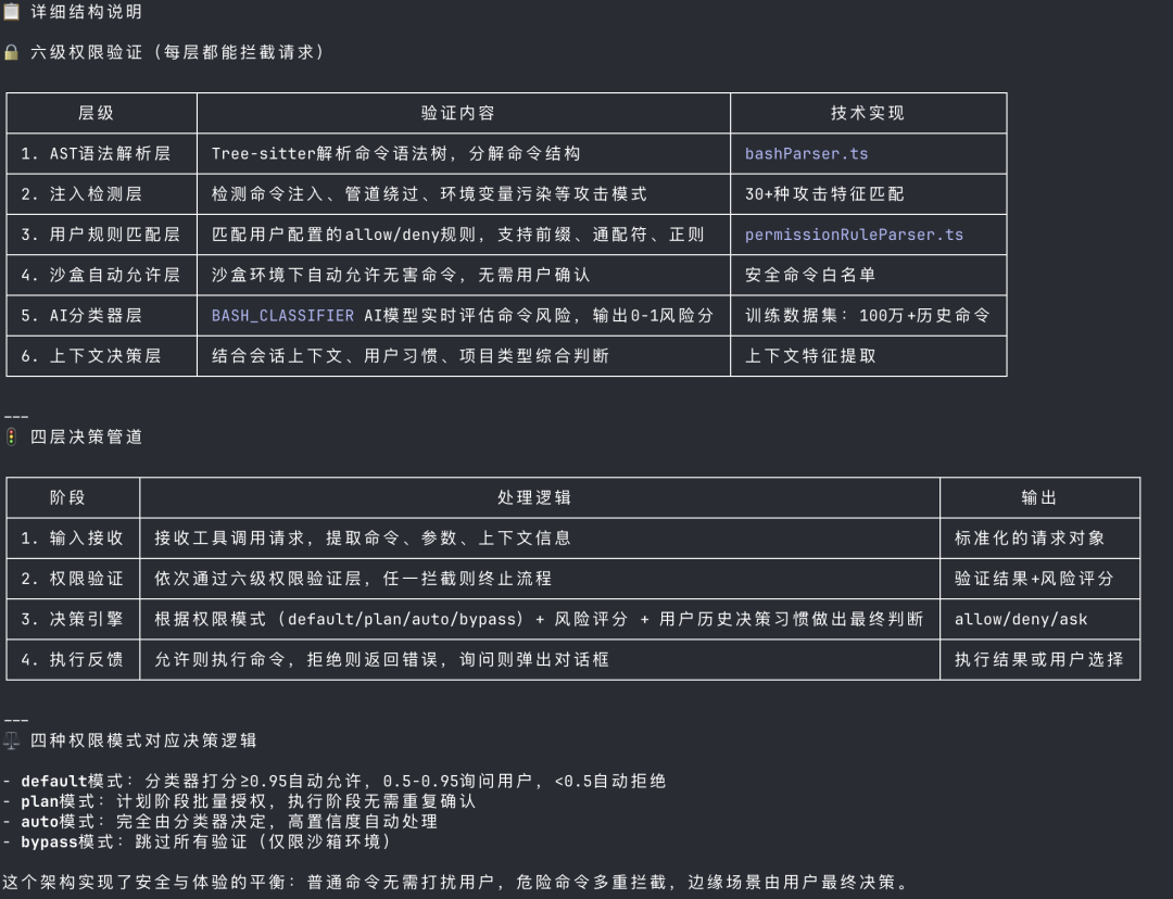 验证通过后还没完。还要经过四层决策管道,逐层检查权限和执行分析,最后才能真正执行。