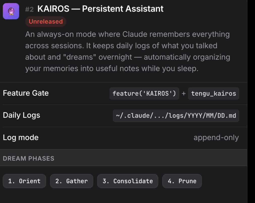代号Kairos,一个持久化助手模式,让Claude拥有跨会话的长期记忆。